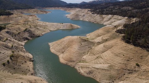 | Signe de la sécheresse qui sévit en Californie, le niveau du lac d'Oroville, dans le comté de Butte, est moitié moins élevé que la normale pour cette période de l'année, le 25 mai. |