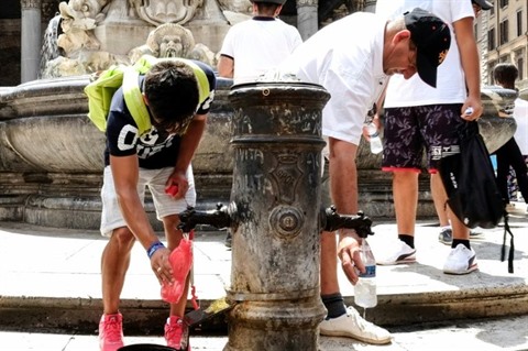 | Des touristes remplissent d'eau leurs bouteilles à une fontaine de Rome, le 28 juillet en Italie. |
