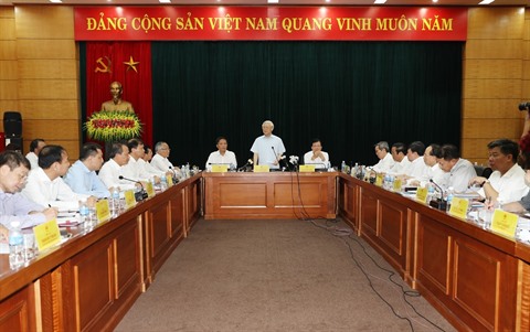 | Séance de travail entre le secrétaire général du PC vietnamien, Nguyên Phu Trong (debout), et les responsables du ministère de l'Industrie et du Commerce, le 11 juillet à Hanoï. |