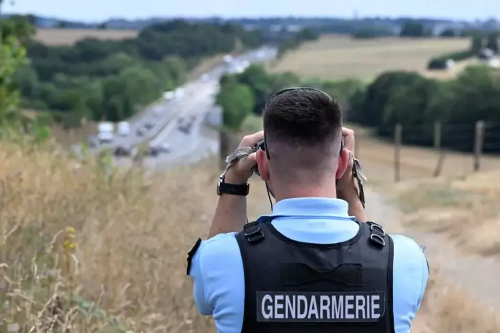 | Un gendarme contrôle la vitesse des véhicules sur une route nationale à l'aide d'un radar jumelle, le 29 juillet 2022 à Poligné, en Ille-et-Vilaine. |