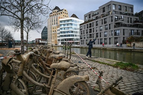 | Clément Charret utilise un équipement aimanté pour récupérer dans le canal de l'Ourcq à Pantin (Seine-Saint-Denis) des objets métalliques, dont de nombreux Vélib', le 1er décembre. |