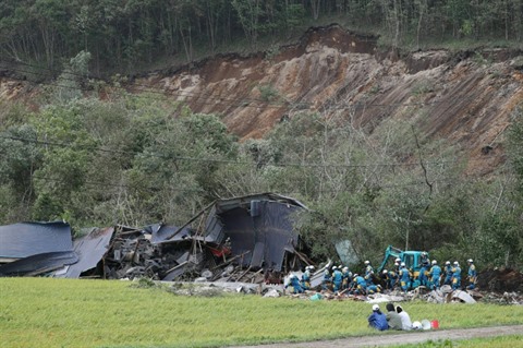| Des habitants d'un village détruit par un puissant séisme regardent les secouristes qui tentent de retrouver des survivants, le 7 septembre, sur l'île d'Hokkaido au Japon. |