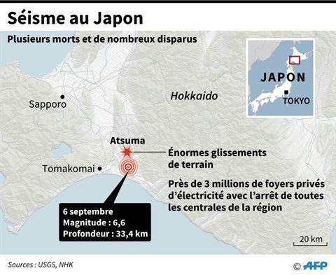 "Nous allons faire tous nos efforts pour sauver des vies", a déclaré le Premier ministre Shinzo Abe après une réunion de crise. Le tremblement de terre s'est produit en pleine nuit dans l'île septentrionale de Hokkaido, à 62 km au sud-est de Sapporo, deux jours à peine après un typhon dévastateur dans la région d'Osaka (Ouest).