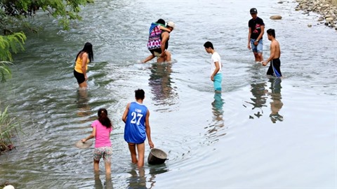 | Des Philippins traversent à pied une rivière après la destruction du pont par un séisme à Surigao, aux Philippines, le 11 février. |