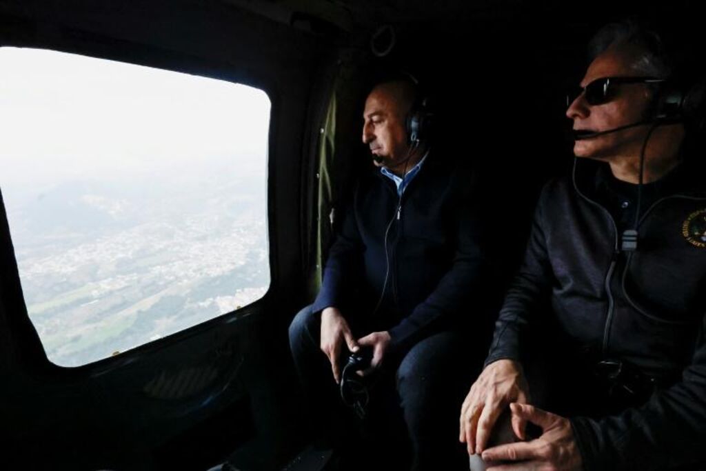 | Le chef de la diplomatie américaine Antony Blinken (droite) et son homologue turc Mevlut Cavusoglu survolent des zones dévastées par le séisme dans le Sud-Est de la Turquie, le 19 février. |