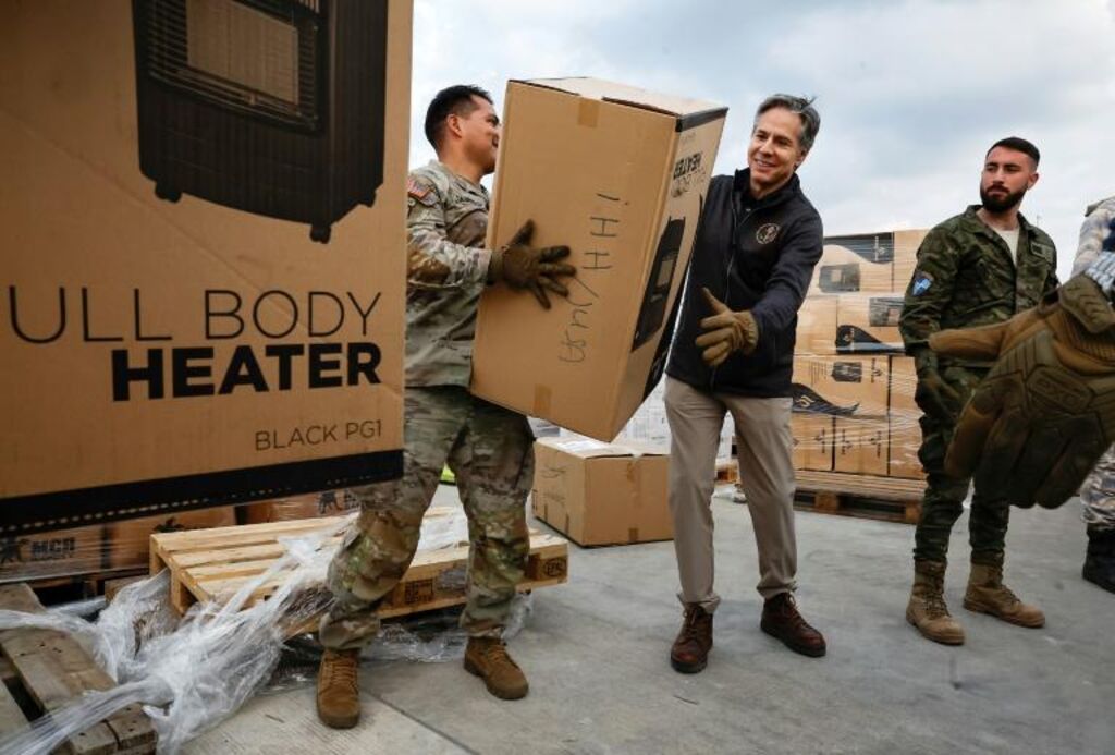 | Le chef de la diplomatie américaine Antony Blinken (centre) aide des militaires américains à charger de l'aide humanitaire pour les victimes du séisme sur la base aérienne d'Incirlik, le 19 février. |