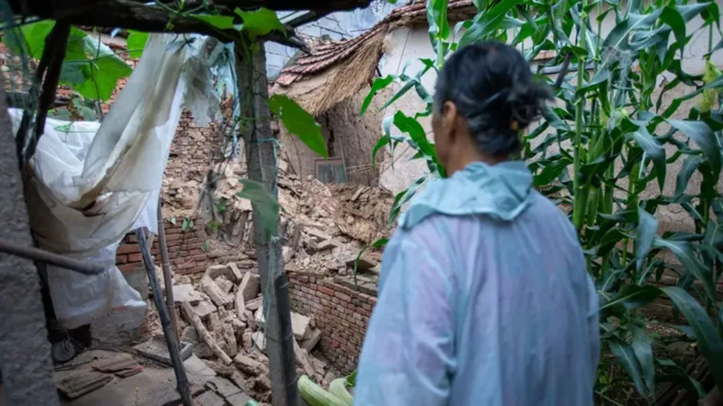 | Une femme regarde une maison endommagée près de l’épicentre du séisme dans le district rural et peu peuplé de Pingyuan dans la province du Shandong. |