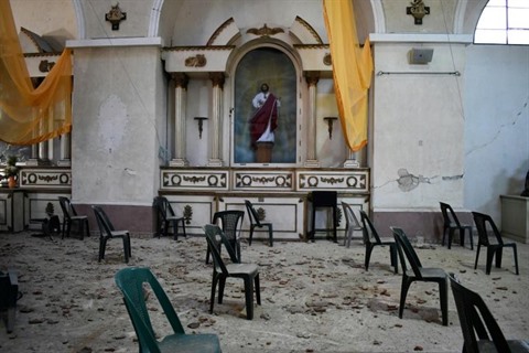 | Une église endommagée après un séisme à Amatitlan, le 16 février au sud de Guatemala City. |