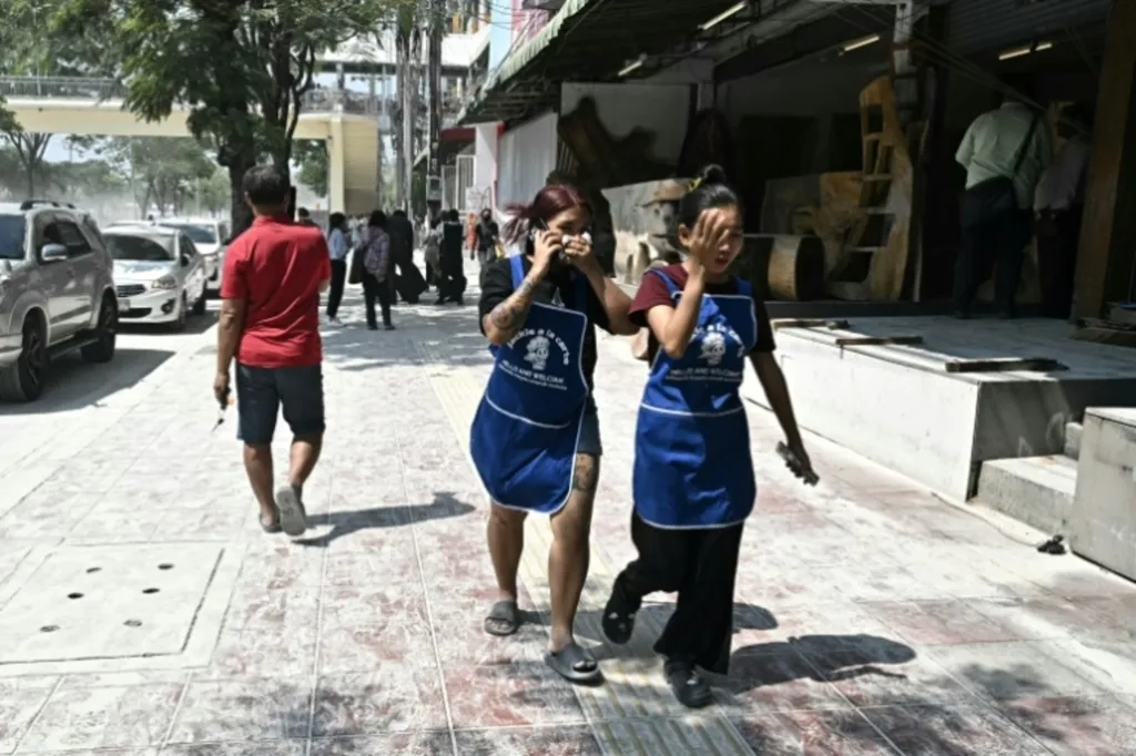 | Des passants à Bangkok le 28 mars, après un puissant tremblement de terre. |