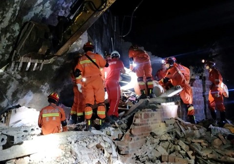 | Des équipes de secours recherchent des survivants dans les décombres d'immeubles après un puissant séisme, le 18 juin à Yibin, dans la province chinoise du Sichuan. |