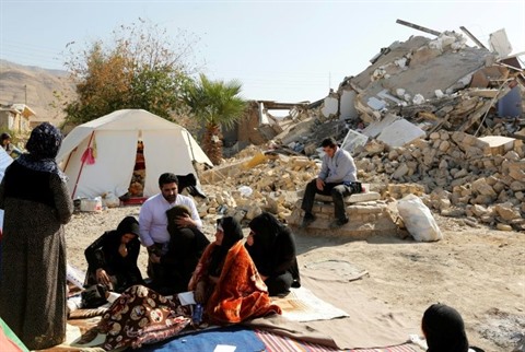 Des Iraniens assis devant leurs maisons en ruine après le séisme ayant frappé l'ouest de l'Iran, le 15 novembre dans le village de Kouik. Photo : AFP/VNA/CVN |