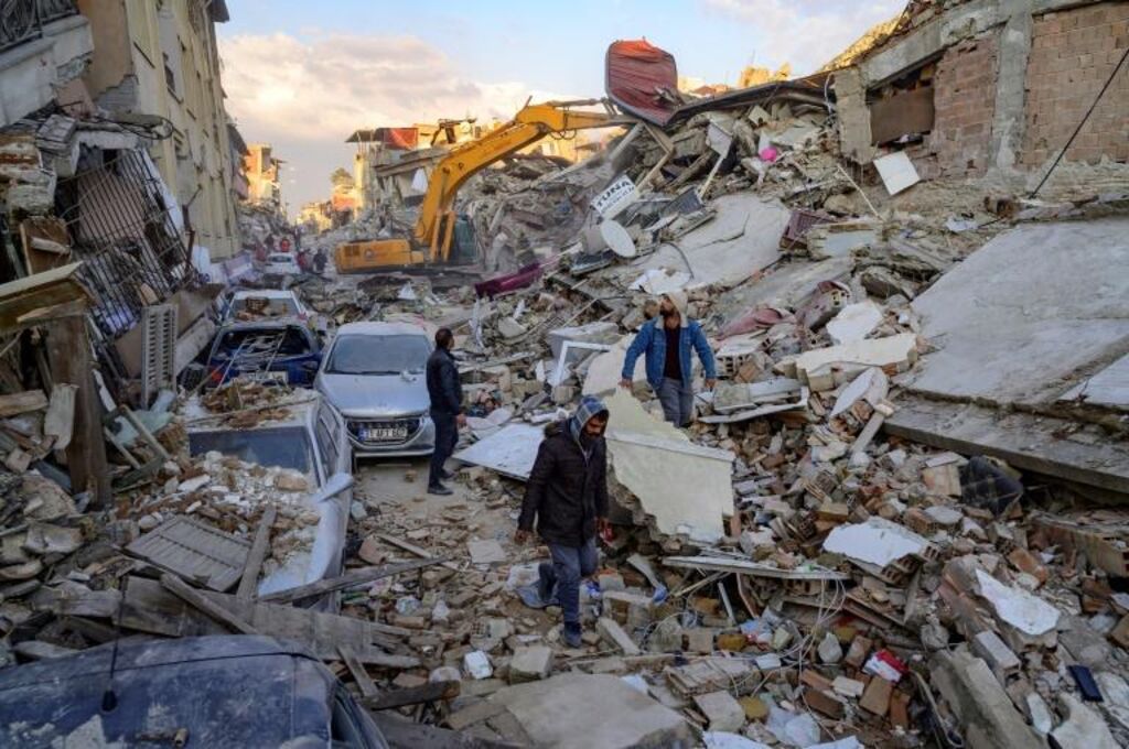 | Des personnes marchent entre les gravats d'immeubles effondrés le 10 février à Antakya, au Sud de la Turquie, cinq jours après l'effroyable séisme qui a frappé la Turquie et la Syrie. |