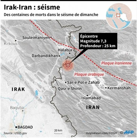 L'épicentre du tremblement de terre, de magnitude 7,3, a été localisé tout près de la frontière irakienne, à une cinquantaine de kilomètres au nord de Sar-e Pol-e Zahab, la ville la plus touchée par le sinistre, avec 280 morts.