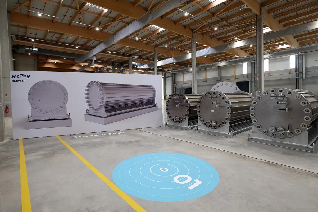 | L'usine d'électrolyseurs (qui servent à produire de l'hydrogène vert) du groupe McPhy lors de son inauguration le 13 juin à Foussemagne, dans l'Est de la France. |