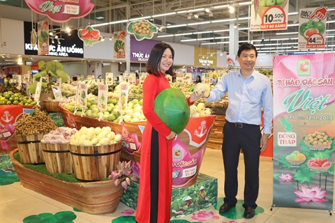 | Phan Hai Hoà, directrice de la région du Sud de Big C et GO!, et Pham Thiên Nghia, vice-président du Comité populaire de Dông Thap, présentent des produits agricoles de cette province du delta du Mékong. |