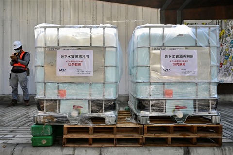 | Le 25 mars, un ouvrier se tient à côté de réservoirs d'eau souterrains sur un chantier de construction à Taichung, dans le centre de Taïwan (Chine). |