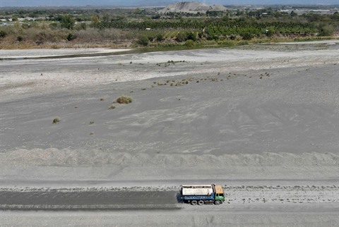| Photo aérienne prise le 16 mars montrant un camion roulant le long d'une rivière asséchée dans le comté de Pingtung. |