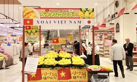 | Des mangues du Vietnam présentés dans un supermarché au Japon. |