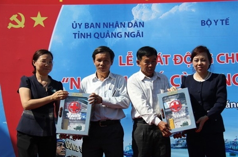 | La ministre de la Santé, Nguyên Thi Kim Tiên (1er à droite), offre des pharmacies et kits de premiers secours aux pêcheurs du district de Ly Son, province de Quang Ngai (Centre). |