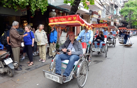 | Des touristes étrangers visitent le Vieux quartier de Hanoi. |