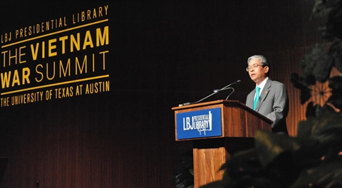 | L'ambassadeur du Vietnam Pham Quang Vinh prononce un discours lors du Sommet de la guerre du Vietnam, le 28 avril au Texas. |