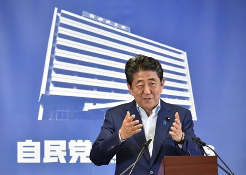 | Le Premier ministre japonais Shinzo Abe lors d'une conférence de presse au siège du Parti libéral-démocrate (PLD), le 22 juillet à Tokyo. |