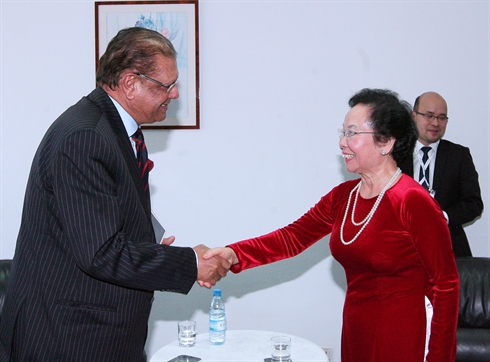 | La vice-présidente de la République, Nguyên Thi Doan, et le président mauricien Rajkesmur Purryag, le 28 novembre à Dakar (Sénégal). |