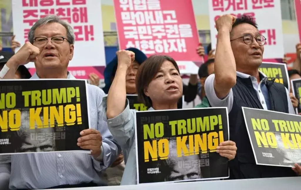 Les manifestants tenaient des pancartes disant "Pas de Trump! Pas de Roi!" et ont souligné qu'il pourrait y avoir des négociations supplémentaires lorsque M. Lee rencontrera le président américain.