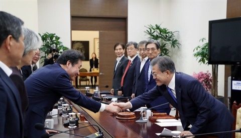 | Le président Moon Jae-in (droite) serre la main au Premier ministre Lee Nak-yon au début de la réunion du Conseil de sécurité nationale tenue au bureau présidentiel à Séoul le 4 mars. |