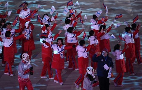 | La délégation de la Corée unifiée, lors de la cérémonie de clôture des Jeux olympiques d'hiver à Pyeongchang, le 25 février. |