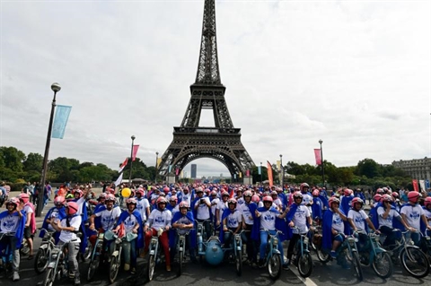 La "plus belle avenue du monde" a pris une teinte bleue le temps que défilent dimanche 11 septembre ces centaines de chefs d'entreprises juchés sur une vieille Motobécane, la fameuse "meule" des années 70, arborant une cape bleu roi et un casque rose bonbon.