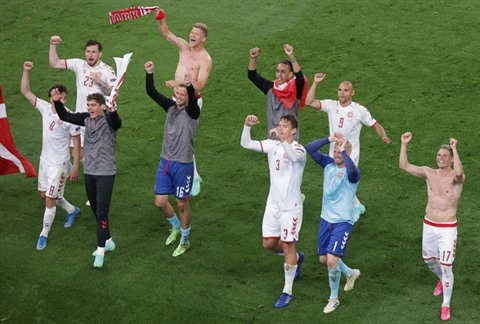 | Les Danois célèbrent leur victoire face au Russes, le 21 juin 2021 à Copenhague |