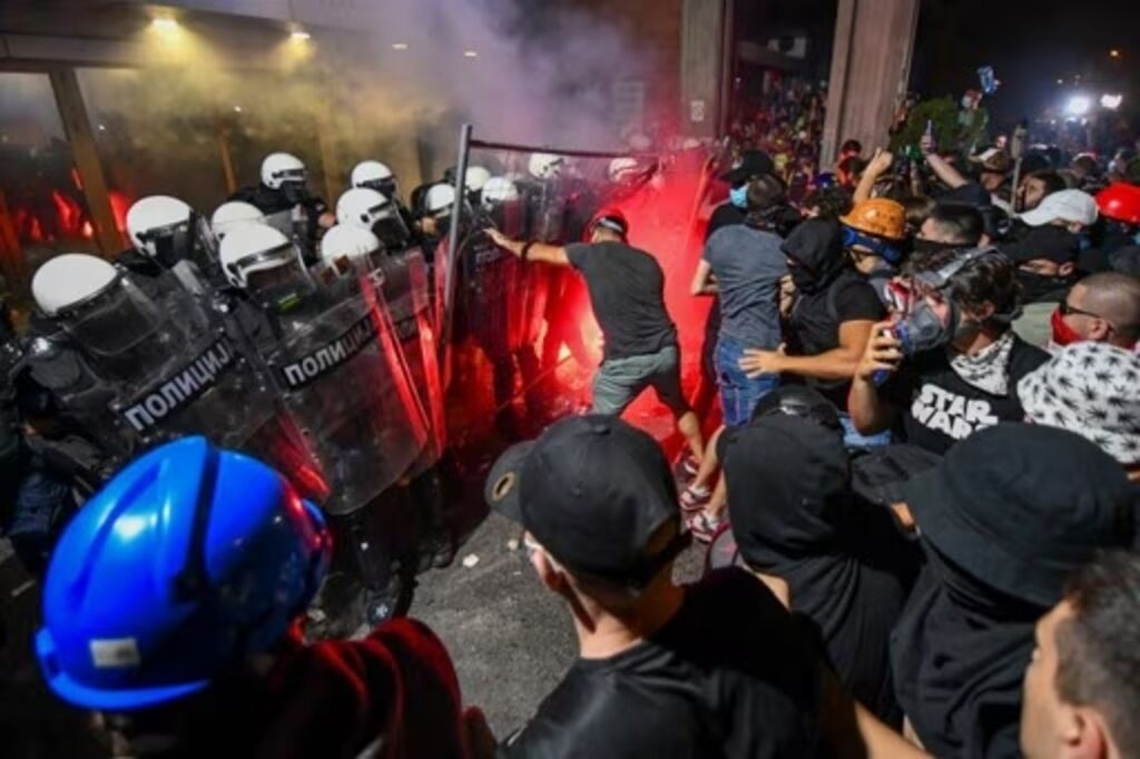 | Affrontement entre des manifestants et des policiers serbes. |