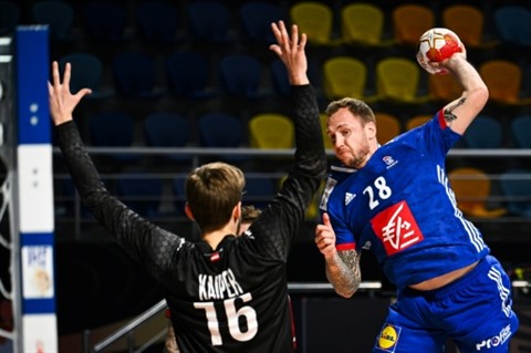 | L'ailier droit des Bleus, Valentin Porte (droite), s'apprête à tirer lors du match de groupes du Mondial face à l'Autriche, au Caire, le 16 janvier. |