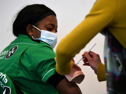 | Un volontaire apprend à vacciner, lors d'une journée de formation, à Londres le 30 janvier. |