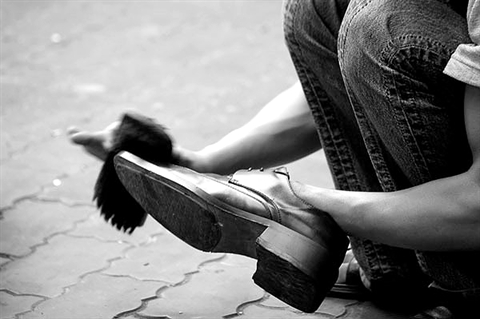 | Chiffon en main, le cireur de chaussures propose ses services sur les trottoirs. |
