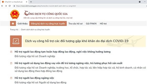 Huit services de soutien aux travailleurs et aux entreprises touchés par la pandémie de COVID-19 ont été lancés sur le portail national de la fonction publique à l'adresse : https://ncovi.dichvucong.gov.vn/p/home/dvc-ncovid-danh-sach-dich-vu-cong.html.