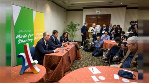 | Les responsables de la candidature de Paris-2024 : Denis Masseglia, Tony Estanguet et Anne Hidalgo s'adressent à la presse à Lima, le 10 septembre |