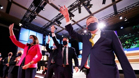 | La délégation de Brisbane 2032 ( de gauche à droite) : Annastacia Palaszczuk, Premier ministre du Queensland ; Adrian Schrinner, maire de Brisbane ; et John Coates, chef du Comité olympique australien, heureux après la désignation de Brisbane comme ville hôte aux JO d'été 2032. |
