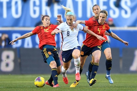 | L'Américaine Julie Ertz (centre) face à trois Espagnoles lors de la rencontre Etats-Unis-Espagne à Harrison (États-Unis) le 8 mars. |
