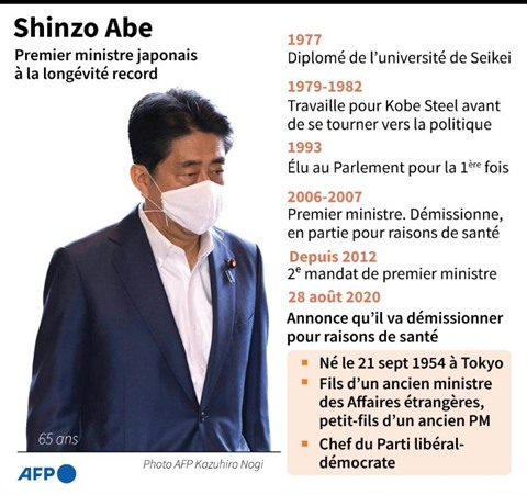 | Le Premier ministre japonais Shinzo Abe annonce son intention de démissionner pour raisons de santé à Tokyo, le 28 août 2020. |