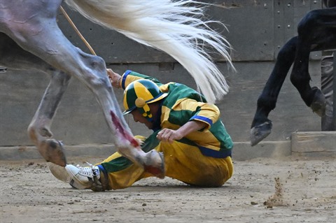 | Le jockey italien Stefano Piras tombe lors d'un faux départ du Palio de Sienne le 2 juillet. |