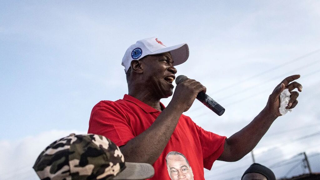 | Le chef du Congrès de tout le peuple et candidat à l'élection présidentielle de la Sierra Leone, Samura Kamara, le 19 juin à Grafton, en banlieue de Freetown. |