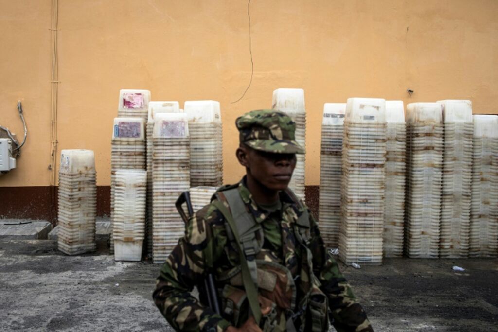 | Un soldat des forces armées de la Sierra Leone devant des boîtes de bulletins de vote, avant la présidentielle, le 23 juin à Freetown. |
