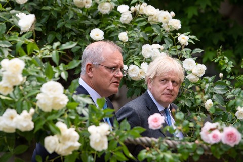 | Le Premier ministre britannique Boris Johnson (droite) et le Premier ministre australien Scott Morrison marchent dans le jardin du 10 Downing Street, au centre de Londres, le 15 juin. |