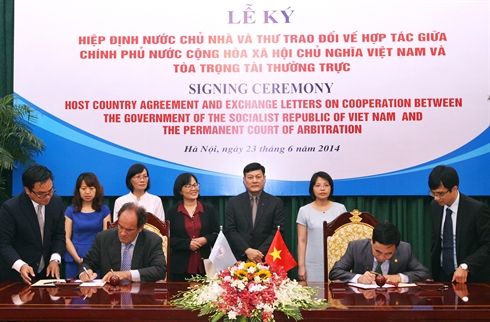 | Cérémonie de signature de pays hôte et une lettre d'échange sur la coopération entre le gouvernement vietnamien et la Cour permanente d'arbitrage, le 23 juin à Hanoi |