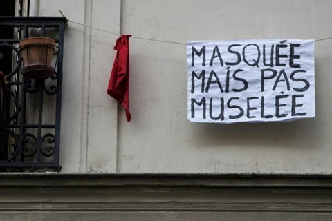| Une banderole dans les rues de Paris, le 8 mai signifiant que la liberté est toujours de mise. |