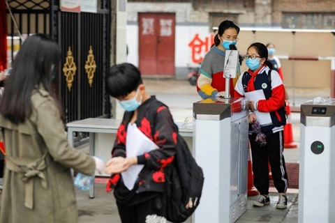 | Des écoliers sont contrôlés à l’entrée de leur établissement le 8 mai à Pingdingshan (province du Henan). |