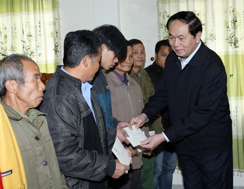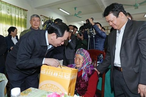 | Le président Trân Dai Quang offre des cadeaux à la Mère héroïne Ngô Thi Den, dans la province de Lào Cai. |