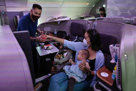 Certains s'installent pour une sieste en attendant le service du repas tandis que d'autres regardent des films sur l'écran intégré au dossier du siège de devant. Environ la moitié des sièges ont été laissés libres, obéissant aux consignes de distanciation sociale.
